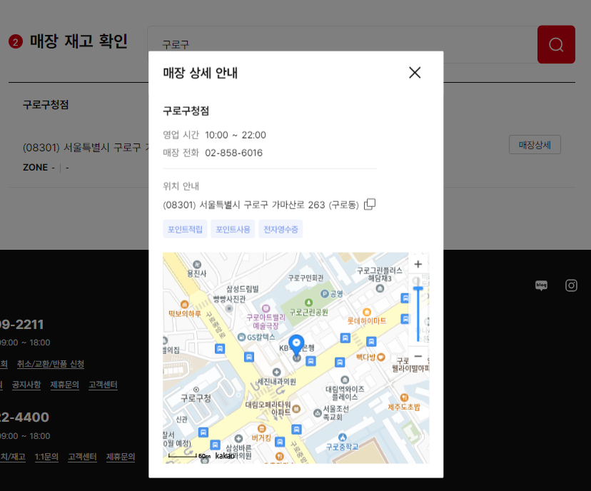6. 구로구청점을 찍어 보았습니다. Zone - | - (없다는 의미 입니다.) 혹시 몰라 구로구청점을 클릭 했더니 매장 위치와 전화 번호 오픈 시간까지 나오네요.