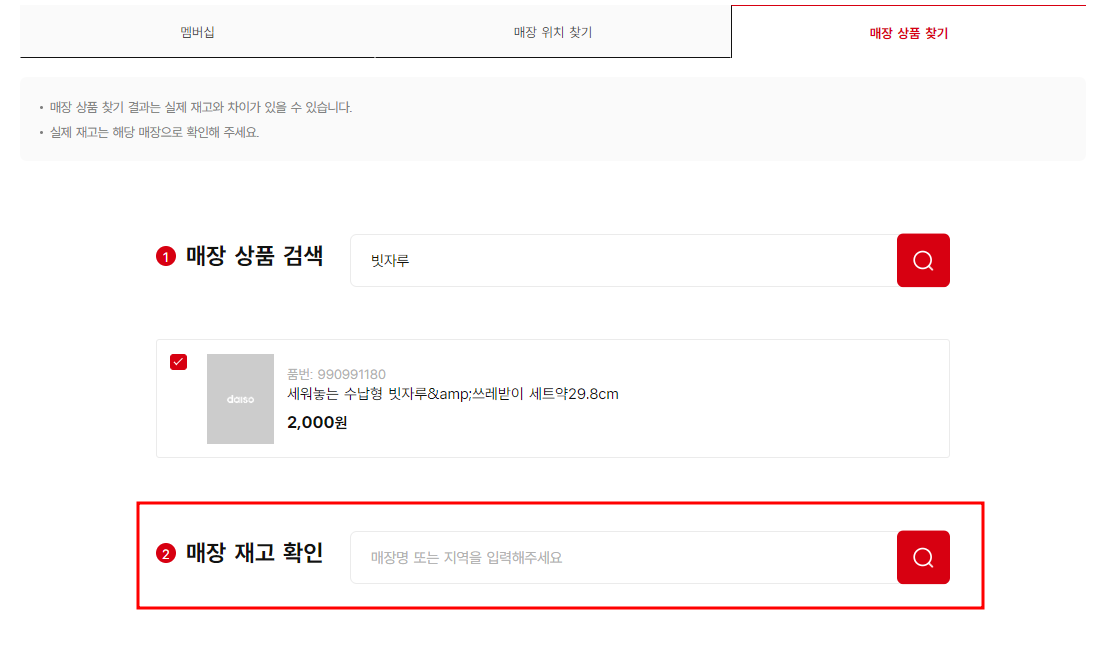 4. 재고 상태 체크 : 해당 매장에서의 재고 여부와 위치 정보를 쉽게 확인할 수 있습니다. 예시로 빗자루를 넣어 봤습니다.