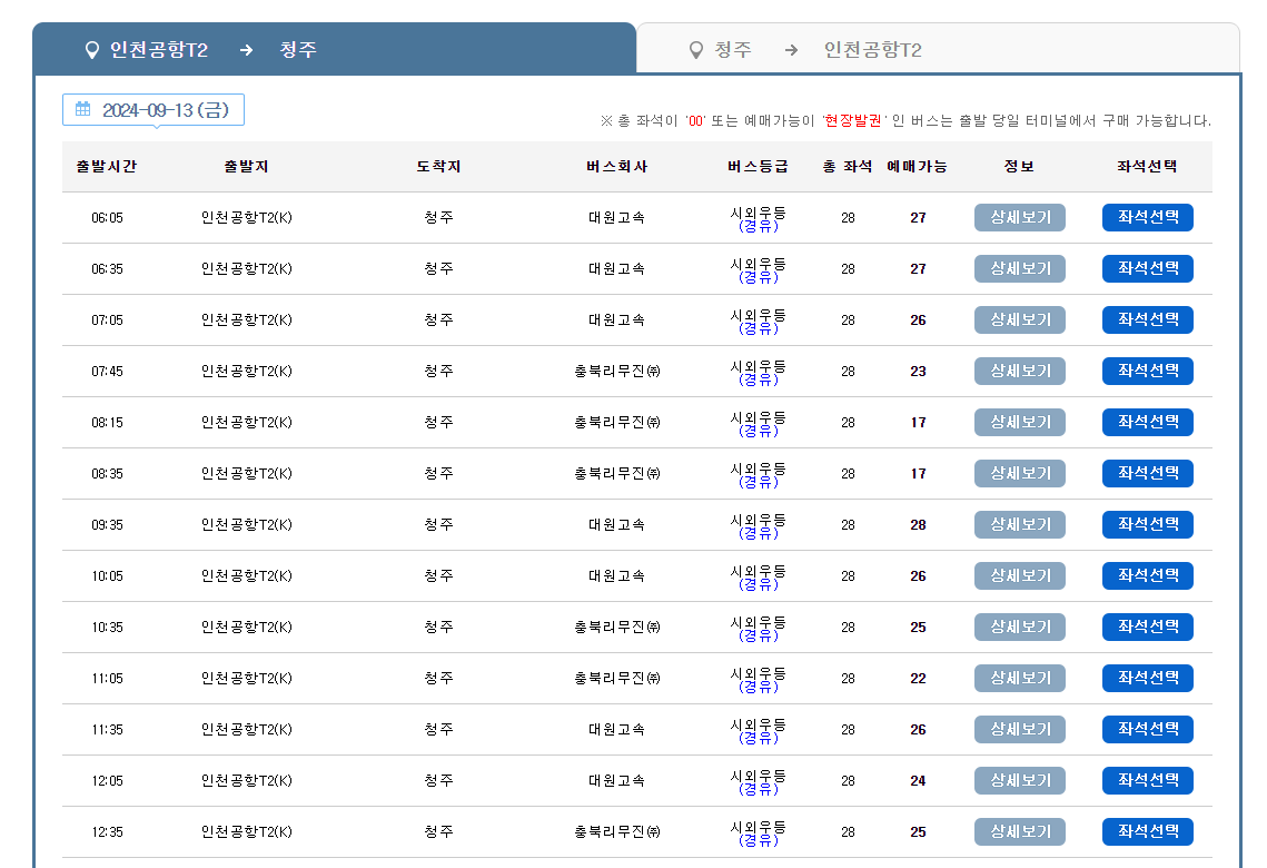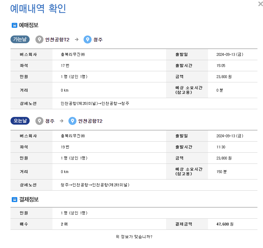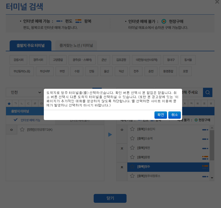 7. 인천 2터미널로 검색을 해 보았더니 아래와 같은 팝업이 떴습니다. 잘 읽고 확인 하세요.
