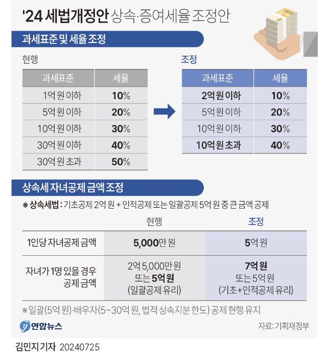 [그래픽] 2024년 세법개정안 상속·증여세율 조정안 | 연합뉴스