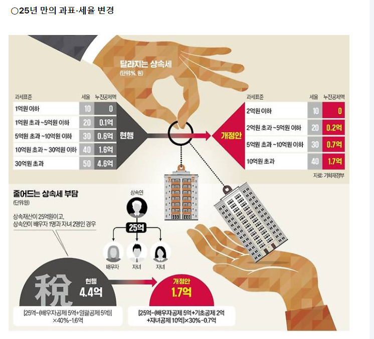 최근, 정부가 상속세 최고세율을 50%에서 40%로 낮췄으며, 자녀 1인당 공제 한도를 5억 원으로 확대했다고 하지요.