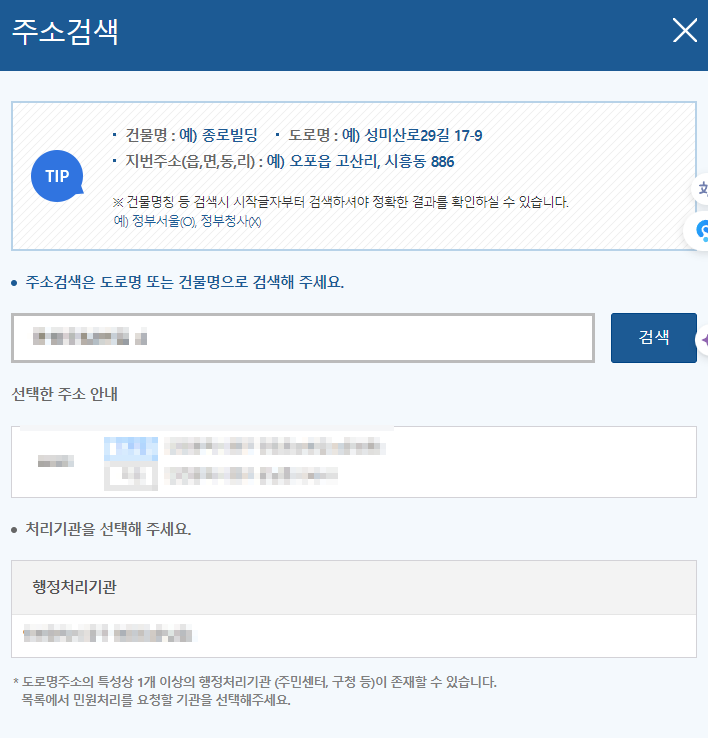 2. 주소를 검색하면 자동으로 행정처리기관까지 뜹니다. 행정처리기관을 클릭하셔야 다음으로 넘어가요.
