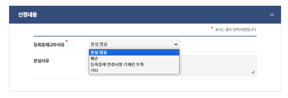 3. 신청내용을 보시면 아래와 같이 4가지 종류가 나옵니다. 본인의 사유를 선택하세요.