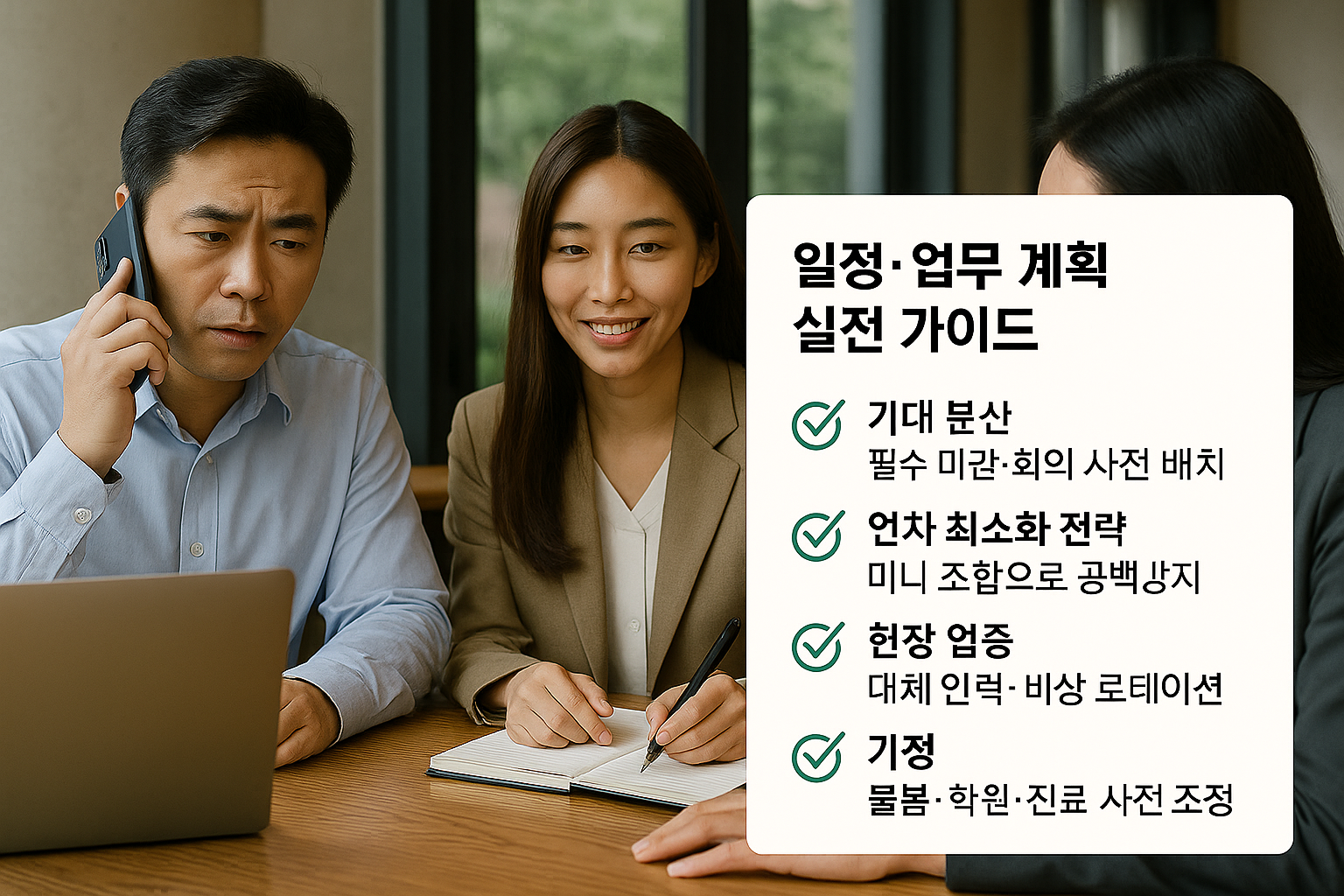제가 직접 겪은 또 하나의 어려움은 가정 일정이 꼬이는 상황이었습니다. 돌봄 공백이나 학원, 병원 예약 문제는 정말 스트레스를 크게 줍니다. 그래서 저는 항상 2주 전 조율 원칙을 세웠습니다.