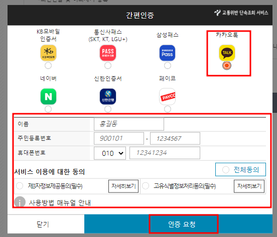 2. 국민 모두가 친숙한 카카오톡, 빈칸에 본인의 정보를 입력하신 뒤 인증요청을 눌러 주세요.